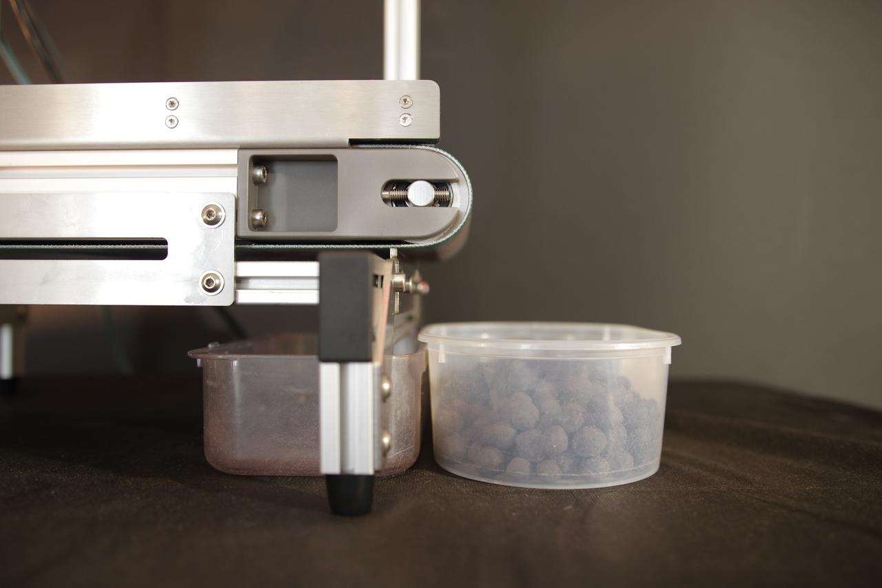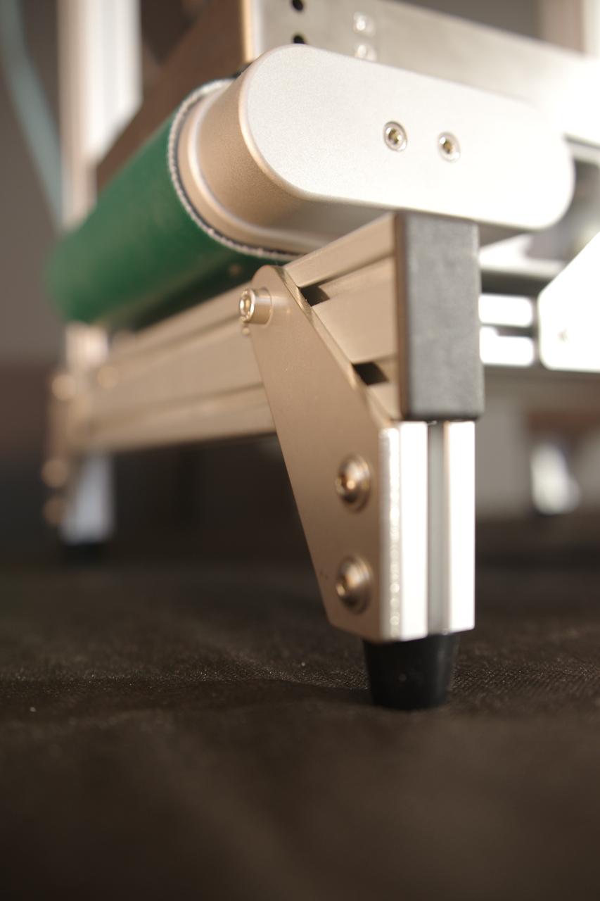 Wet, sticky, dirty materials are handled safely; the conveyor belt is made from low-abrasion, water-resistant material, its electronics is encapsulated. Scraper at belt return can be positioned to clean the belt from sticky residues. There is enough space both under the scraper and discharge cylidner for various collection containers. Feet are foldable (for transport) and can easily be exchanged for a longer type.